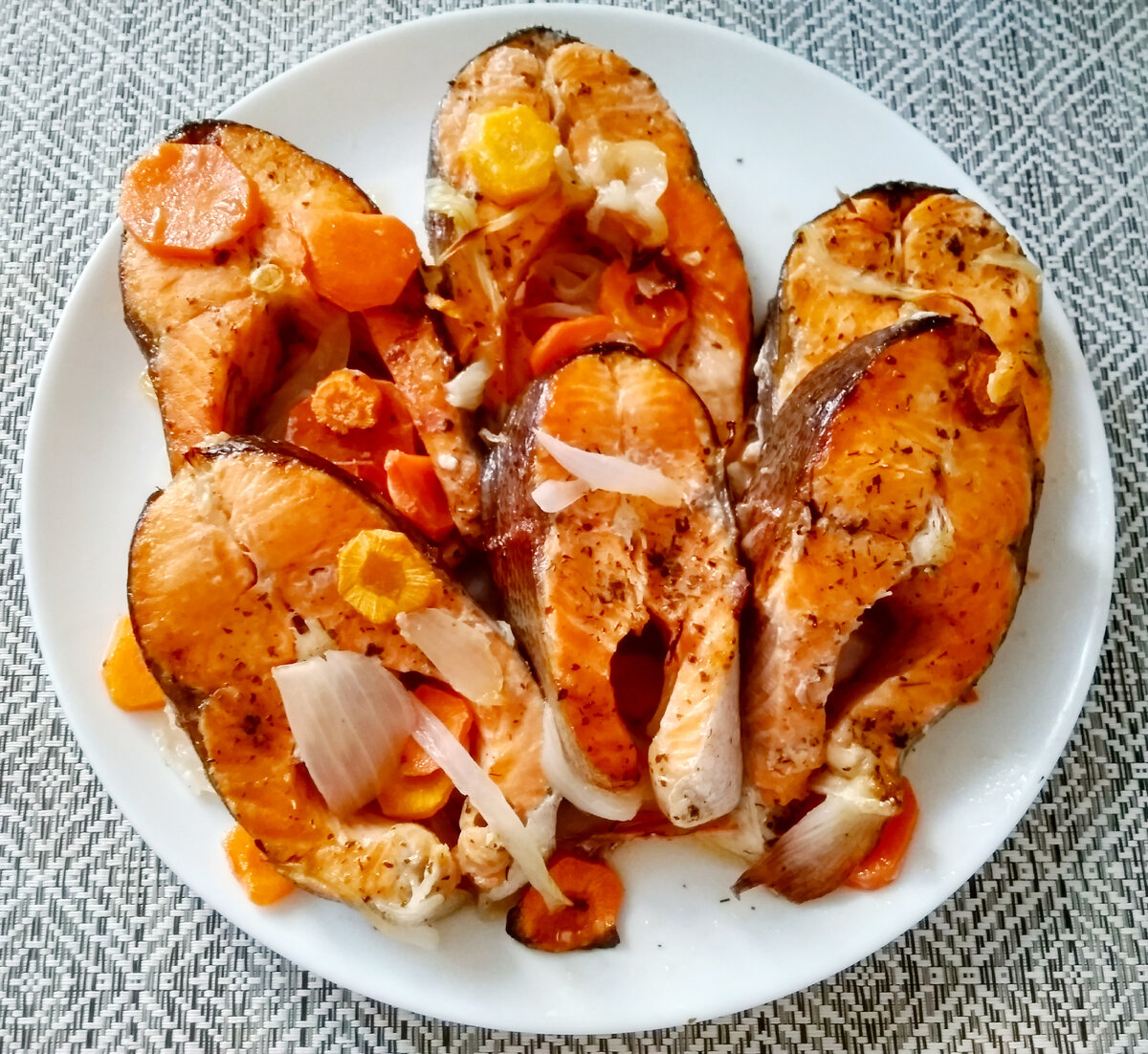 Привет, друзья! Сегодня делюсь с вами рецептом, как просто и вкусно приготовить рыбу в духовке. Для этого рецепта можно взять любую рыбу, какая вам нравится. У меня сегодня форель. Для начала нужно рыбу почистить и нарезаю ее на кусочки толщиной в 4 – 5 см. Если вы возьмете тилапию, морской окунь или какую-то другую рыбу, но размер ее будет небольшой, то я советую ее не нарезать на кусочки. Рыбу можно запекать на противне, но лучше запекать в жаропрочной форме с высокими бортиками, чтобы сок, который появится от овощей и рыбы, не растекся по противню. Рыба будет не только запекаться, но еще и тушится. От этого она станет еще сочнее и вкуснее.