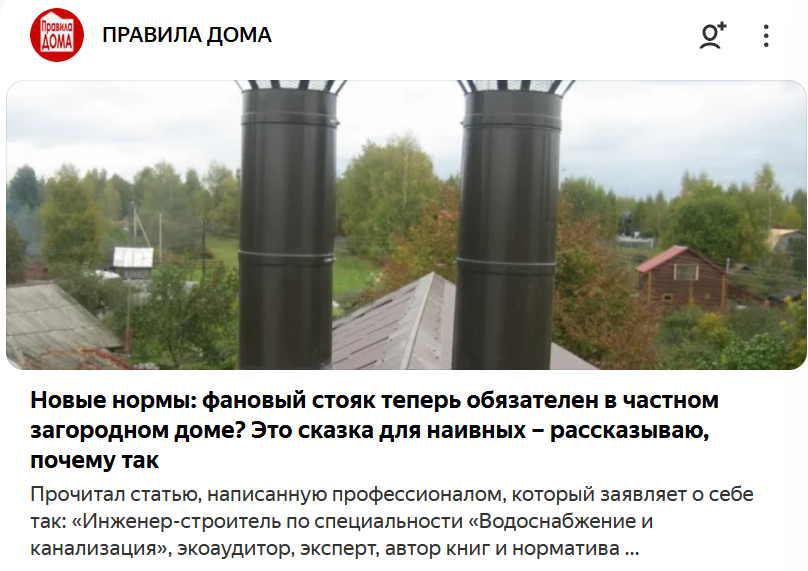 Встретил в ленте статью, в которой автор, ссылаясь на законы, утверждает, что для частного домостроения строительные нормы не обязательны. Позволю себе не согласится с этим утверждением, не смотря на то, что формально - да, не обязательны, проект можно не делать. Собственно, вот карточка этой статьи: Автор критикует вот эту мою статью, в которой я рассказываю о том, что в новой редакции СП 30.13330.2020 "Внутренний водопровод и канализация зданий" появилось (благодаря в том числе и моим усилиям) требование об обязательности его устройства в частных домах. Цитирую аргументы автора: Дело в том, что свод правил (он же СП 30.13330.2020) устанавливает требования к проектированию, но... Но для строительства частных домов, которые называются объектами индивидуального жилищного строительства или индивидуальными жилыми домами, в соответствии с понятием, прописанным в пункте 39 статьи 1 Градостроительного кодекса Российской Федерации, так вот – для строительства индивидуального жилого дома