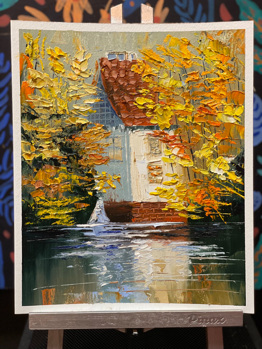 Мы почти завершили работу над картиной - остались лишь кроны деревьев. Для их рисования мы продолжаем использовать мастихин. с помощью индиго “прочертим” тонкие стволы и ветки деревьев. Густым желтым, оранжевым (в некоторых местах охрой) с помощью коротких горизонтальных мазков мастихином наращиваем фактуру крон деревьев. Стараемся разнообразить мазки у крон деревьев - иногда накладываем цвет коротко и “рыхло”, а иногда густо, широко.