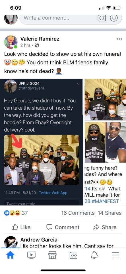 Это из разряда "конспирологии". Убитый в одежде с надписью "умер Джордж Флойд" фотается по полной программе))) И тут два варианта. 1. Либо он внатуре живой, и те, кто устроил этот цирк, просто троллят человечество. 2. Либо Флойд таки умер, а это уже проделки (сейчас проги по созданию виртуальности уже на божественном уровне, как Илон Маск, поющий про "Земля в иллюминаторе") какой-то группы. И здесь у нас опять раздвоение. 2.1. Если это группа, которая замутила театр, тогда они опять таки троллят. 2.2. Если это иная группа, то тогда хотят подставить группу, которая осуществила публичную "казнь" негра. Итак, если это троллинг, то тогда эти силы просто уверены в себе настолько, что ничего не боятся. Если это атака, то можно ждать раскрутку этой фотки по Америке, чтобы ОСТУДИТЬ негров, объяснив им, что они устроили погромы из-за обмана. Ну а обманул их ... Байден!!! Ведь он же уже начал пиариться на волне протестов, а значит основной бенефициар для мозгов чёрных братьев - Джо Байден. Сейча