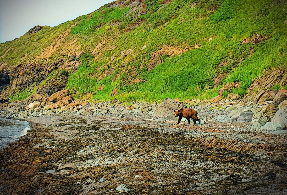 Впереди показался мыс Бакланий (54.41068 142.66348). Я прошел несколько метров по берегу в сторону мыса, и вдруг увидел, что сверху спускается медведь. Медведь был не слишком большой, мне показалось, что он уже довольно старый. Первым делом я начал свистеть в свисток, медведь на это никак не реагировал. Я начал кричать - тоже ноль реакции. Медведь потихоньку спустился на берег и начал идти в мою сторону. Тут уже я реально начал бояться. Голова сразу начала вспоминать всю информацию о том, как себя вести при встрече с медведем, которую я изучал перед походом. Я быстро нашел высокий камень, залез на него, поднял руки и начал свистеть и кричать. Медведь продолжал все это игнорировать и приближался ко мне все ближе и ближе. Мозг работал четко, я достал фальшфейер, вытащил его из чехла и был готов зажечь в любую секунду. Было видно, что медведь видел меня и шел целенаправленно ко мне. Это не было похоже на то, что он хочет атаковать меня. Скорее ему было любопытно, что это за зверь стоит на его тропе, и он медленно подходил все ближе и ближе. Я зажег фальшфейер, когда между мной и медведем было около трех метров. Яркий красный огонь, много дыма и едкий запах сделали свое дело - медведь развернулся и пошел прочь. Я наконец-то смог немного расслабиться. Я осознал, что в этой стрессовой ситуации мозг работал очень четко и ясно, я делал все по алгоритму и помнил все, о чем читал. Все-таки когда перед твоим лицом смерть, то организм способен на многое.