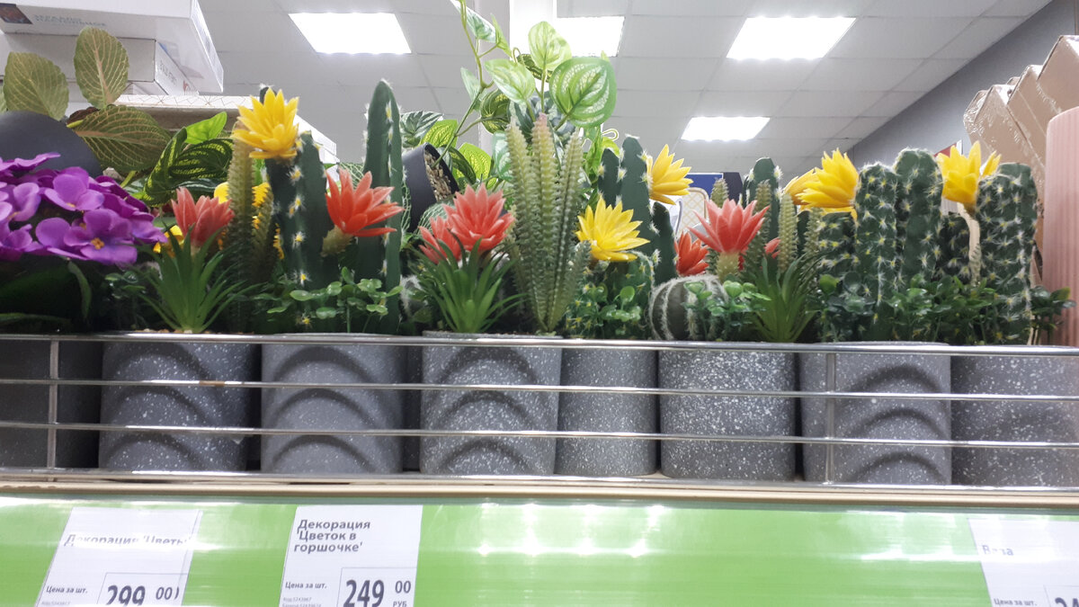 - Цветущие кактусы в ассортименте, искусственные, по 249 рублей.