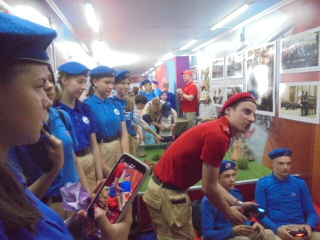 По теме организации цветных революций, в одном из вагонов поезда, офицером-экскурсоводом был предложен вниманию ребят не только рассказ о технологиях "марионеточников", но и интерактив в виде приложения для мобильных устройств. Благодаря ему картины на стенах вагона "оживали" в мобильниках посетителей, а подаренный буклет становился таким же "оживающим" методическим пособием для углубления в тему уже после ознакомления с выставкой. На игровой площадке юнармейского вагона наши ребята скромненько столпились у входа, и мне пришлось их чуть ли не силой втаскивать в стрелялки-игралки-танчики. Юнармейцы, сопровождающие поезд, любезно мне помогали, увлекая гостей из Лётки в игровую программу. Увлекли. Мы их оттуда потом еле вытащили.