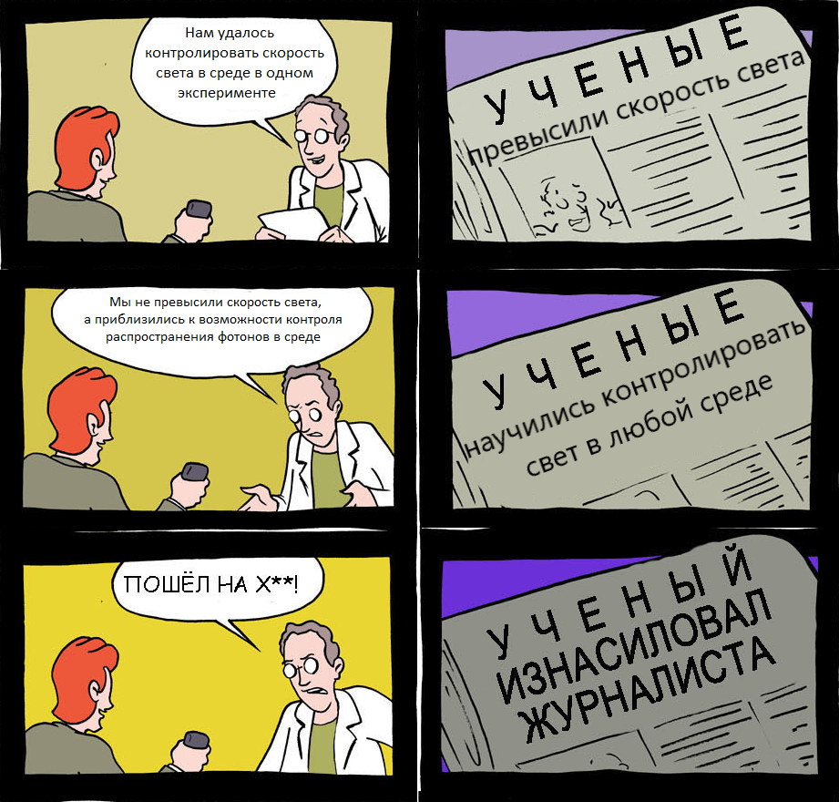 За последние пару дней интернет облетела «новость» о том, что «американским физикам удалось превысить скорость света на 30%». Некоторые издания (вполне серьёзные, кстати) пошли дальше, написав, что скорость света, 299 792 458 м/с, больше не является константой. Это же сенсация! Всё, добро пожаловать в совершенно новый мир! На поверку, как обычно, всё оказалось гораздо проще. Ну, насколько физика может быть простой. Обратившись к первоисточнику, становится ясно, что речь о групповой скорости света в плазме, превышающей фазовую скорость в этой же среде, а не о скорости света в вакууме. Это так называемый эффект Вавилова-Черенкова, который был открыт ещё в 1930-х годах, и за который в 1958 году Павел Черенков, Игорь Тамм и Илья Франк получили Нобелевскую премию. Просто на этот раз физики смогли данный процесс контролировать, что, к слову, поможет в изучении природы сверхмощных лазеров, с помощью которых и была увеличена групповая скорость импульсов света. Для тех, кто работает или увлекае