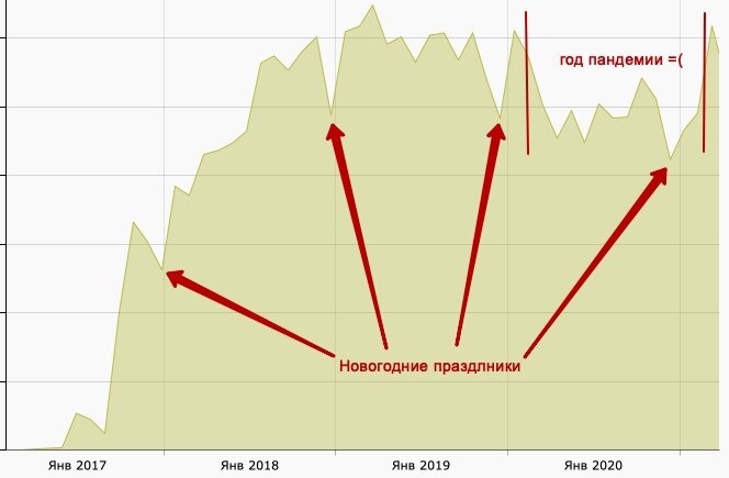 Графики доходов парсера (с детализацией по дням и месяцам) прикреплю ниже – на них достаточно хорошо виден пандемический провал длиною в год. На графиках статистика только по доходам парсера.