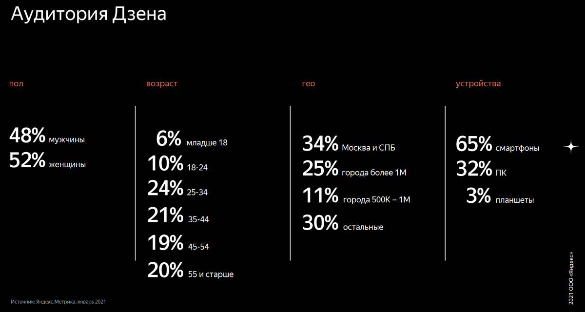 Что касается тематики статей, аудитория этой платформы, которая в декабре 2020 года составляла более 63 миллионов посетителей в месяц (по данным сервиса Яндекс.Радар), – в большинстве своем люди старше 25 лет, поэтому стоит сделать акцент на темах, привлекающих взрослых, зрелых читателей.