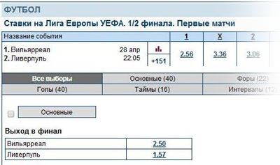 В матче ½ финала Лиги Европы встречаются испанский Вильярреал и английский Ливерпуль. БК Марафон считает явным фаворитом противостояния Ливерпуль, хотя в отдельном домашнем матче у Вильярреала шансы на победы даже чуть выше. Если игрок отдает предпочтение Вилярреалу, то непосредственно перед этой игрой он может сделать следующие ставки: