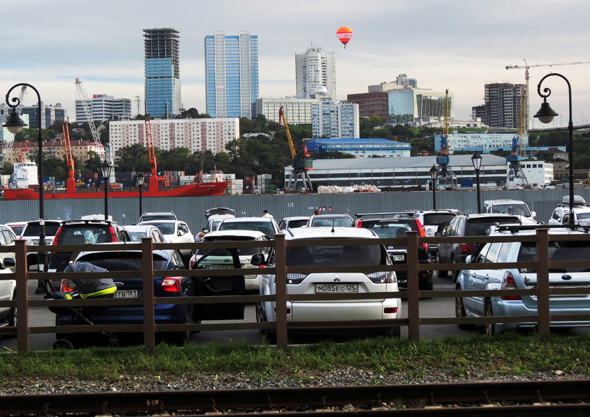 Прежде в центр ходила даже городская электричка - от Первой речки через километровый тоннель имени Сталина сюда ведёт отдельная железная дорога, которую точно так же можно было бы назвать концом Транссиба. Станция Мыс Чуркин без вокзала - у тех контейнеров, и мы так и не сподобились к ней спуститься. На заднем плане - Эгершельд и рейсовый пассажирский катер "Лотос", возвращающийся во Владивосток из Славянки.