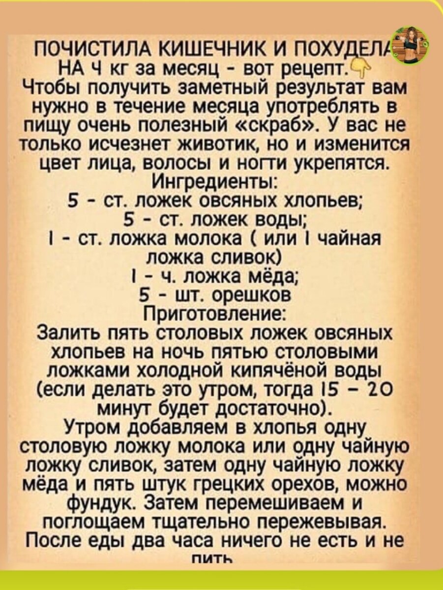 Почистила кишечник и похудела! Или история о том, как вас разводят создатели всевозможных диет. В силу своей работы, мне часто приходится читать всякие паблики для похудения. И нет, не для того, чтобы улучшить свои знания, а для того, чтобы понимать, какие знания о похудении сейчас у людей. Помню, пободные статьи или диеты были модны ещё лет 20 назад. Думала, что с той поры многое изменилось. Но, к моему удивлению, люди до сих пор верят в подобную чушь. Пробуют на себе - ничего не получается, или невозможно следовать и срываются, или помогает, но временно. Потом ищут новую модную диету/способ похудения. И так по кругу. По замкнутому кругу... Запомните, никакое супер-пупер блюдо или диета не способны сделать вам тело мечты. Просто примите это. Давайте разберём этот конкретный пример (на главном фото). Почему он не работает? 1. Не все любят овсянку и те ингредиенты, которые предлагает автор. 2. У человека может быть аллергия на некоторые продукты, которые входят в состав (мёд, молоко,