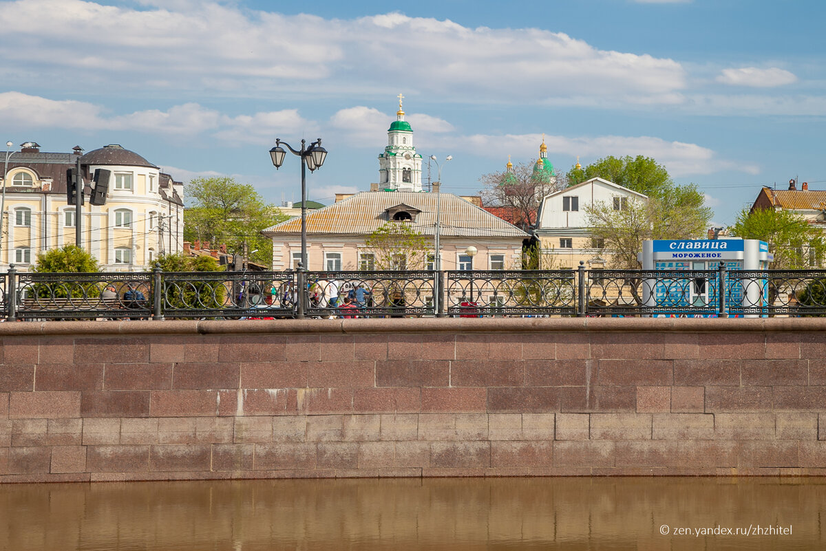 Говорят, что города, расположенные на воде, нужно смотреть с воды. В Астрахани, нагулявшись по улицам, мы решили прокатиться на прогулочном теплоходике по Волге. Теплоход отправляется от ресторана «Поплавок». Набережная в этом месте хорошая и благоустроенная. Она носит название Петровской и идет до места впадения реки Кутум. Далее пейзаж сменяется на индустриальный. Видны портовые краны и склады. У причалов стоят грузовые суда. Астрахань раньше была очень богатым городом за счет торговли. Сейчас это в прошлом. Несколько эпох и сущностей Астрахани в одном фото. Проходим под Новым мостом, соединяющим основную часть города с Городским островом. Городской остров находится от нас с левой стороны, по карте там находится городской пляж. Но выглядит все не очень благоустроено. Теплоход идет далее до впадения в Волгу рек Прямая Болда и Кривая Болда. Здесь теплоход огибает остров и движется по Волге. Ранее мы двигались по Городскому рукаву, теперь выходим в более широкую часть. Расстояние до бе