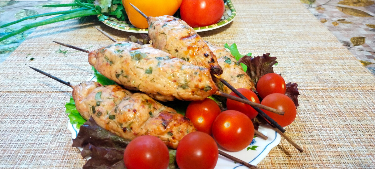 на 100грамм -101.8 ккал. Б/Ж/У - 19.8 г/ 1.6 г/ 2 г. Чтобы куриный фарш, которому придают обязательную продолговатую форму, надежно закрепился на деревянном шампуре необходимо на предварительном этапе его тщательно вымешать и отбить, с силой бросая мясной ком из руки в руку или ударяя о рабочую поверхность/емкость.