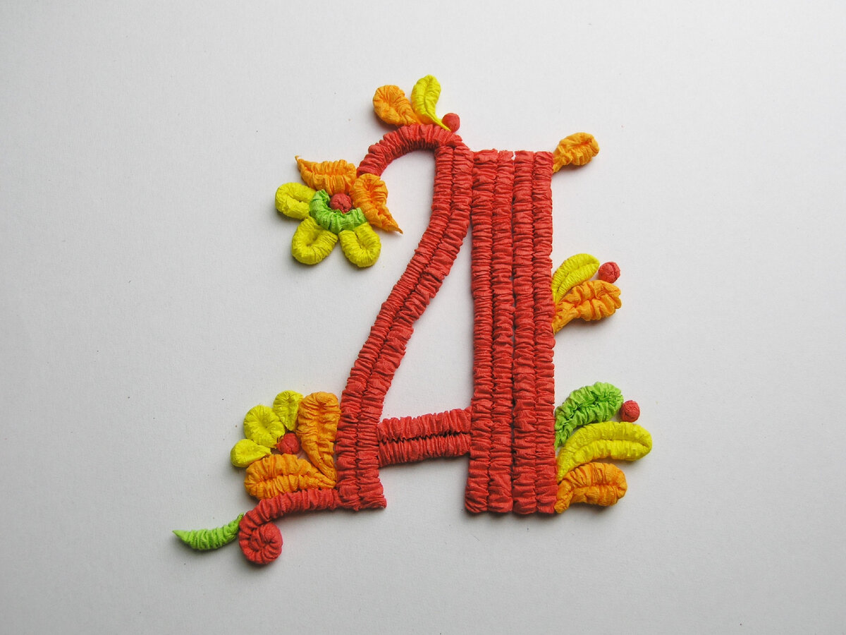 В старинных книгах первую букву текста украшали узорами или растительным орнаментом. А мы можем сделать буквицу из гофротрубочек! Такой буквицей можно оформить открытку, украсить узорами первую букву своего имени или сделать буквицу кому-то в подарок. Эту буквицу можно сделать из четырёх красных, одной оранжевой, одной жёлтой и одной зелёной гофротрубочки. Листики и цветочки складываются из маленьких одинарных гофротрубочек. Попробуйте, это интересно! Как сделать гофротрубочку Бумага для гофротрубочек Клей для работы с гофробумагой