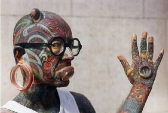 Люди используют массу причин для нанесения татуировок. Одни сделали татуировку, как говорят «по глупости». Другие – из-за непреодолимого желания выделиться из общей массы и демонстрировать свои «крутые» наколки остальным, с гордостью оголяя эти части тела. Третьи – татуировались для удовлетворения своих потребностей, нанеся на кожу какой-нибудь значимый для них знак, символ или слово. Такие люди, как правило, стараются не демонстрировать свои наколки. Представляю Вашему вниманию 10 самых татуированных личностей планеты. 5. Этьен Дюмон. Этот парень проживает в Швейцарии и является одним из самых влиятельных газетных и художественных критиков. Однажды, он решил кардинально изменить себя по каким-то, до сих пор неизвестным причинам. Надеемся, что рога – имлантанты помогут Этьену обрести себя и жить в гармонии. 4.Дэнис Авнер. Дэнис получил псевдоним — «Человек-кот». Помимо татуированного тела, Дэнис имплантировал себе усы и изменил форму лица. Он так вошел в образ кота, что начал карабкат