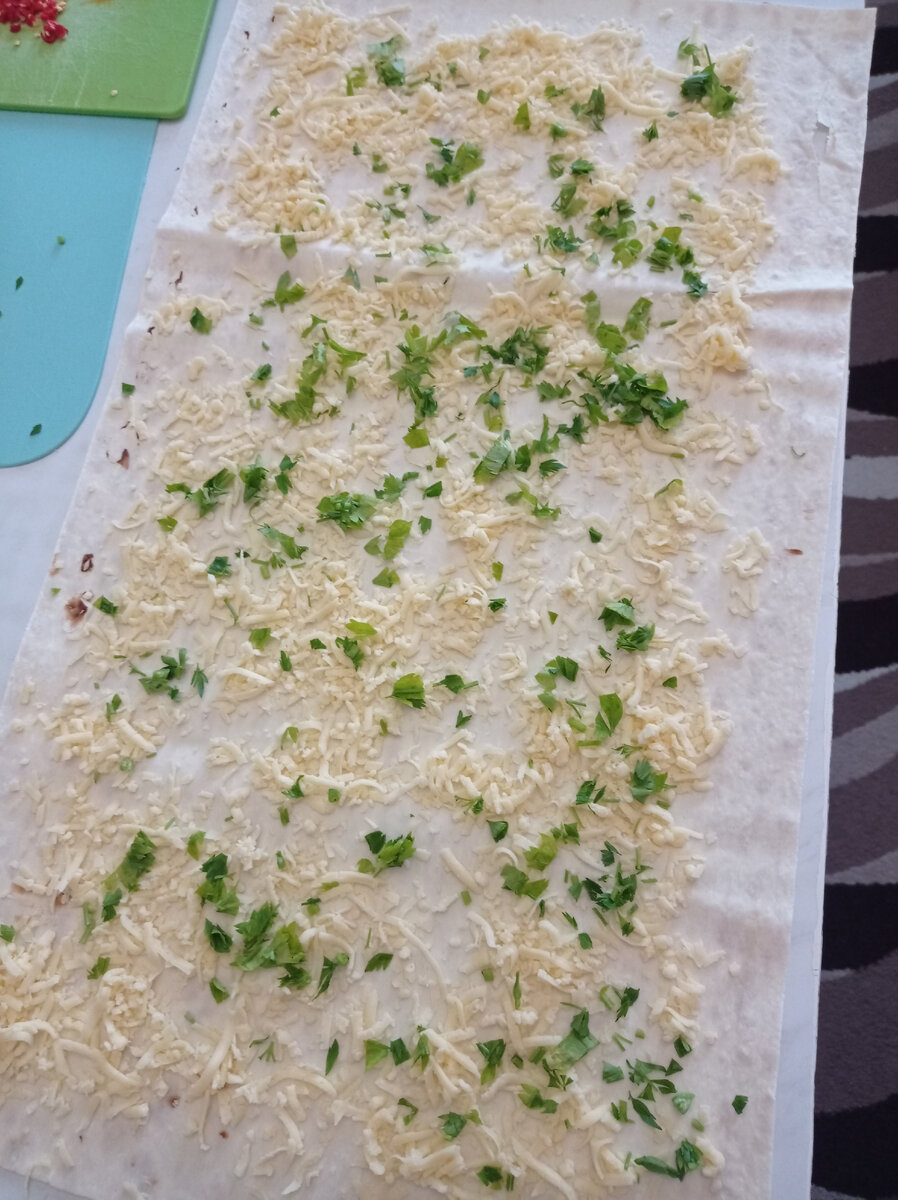- В фарш добавить зелень, сметану, поперчить, немного присолить, все перемешать. Выложить на первый лист лаваша тертый сыр (немного оставить для посыпки рулета), сверху присыпать зеленью (можно добавить побольше чему у меня на фото, вкус будет ярче)