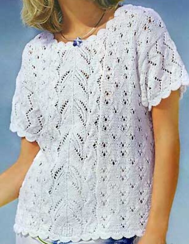 Красивый узор с ажурными полосами из листьев отлично подходит для вязания летнего топа из хлопка.