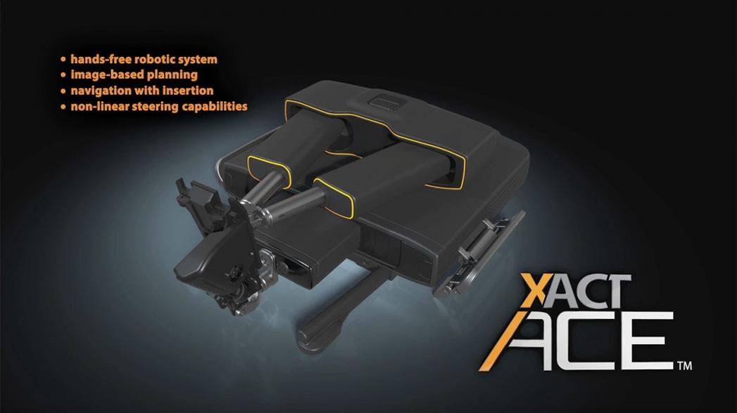 Разработанное израильской компанией XACT Robotics устройство XACT ACE - это роботизированная система, не требующая использования рук и разработанная для повышения точности достижения целей при чрескожных процедурах, проводимых под контролем компьютерной томографии, включая абляции, биопсии и адресную доставку лекарств, с высоким уровнем безопасности, предсказуемости и точности. Роботизированная система XACT ACE состоит из двух основных компонентов - робота и консоли. Консоль используется для планирования процедуры, управления инструментом и контроля его продвижения. Робот весом менее четырех килограммов устанавливается на пациента, чтобы помочь радиологу выполнить чрескожную процедуру без необходимости вручную направлять введение инструмента, обычно иглы, для достижения цели в теле. Перед использованием робота радиолог определяет цель, выбирает точку входа на теле пациента и планирует траекторию движения инструмента с помощью программного обеспечения XACT. Это позволяет "освободить рук