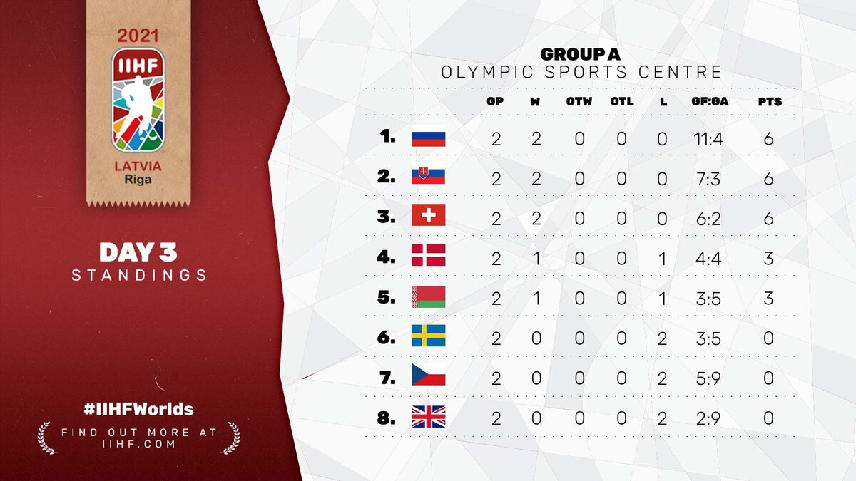 Хоккей ЧМ-21. Турнирная таблица после двух туров. Группа «А»