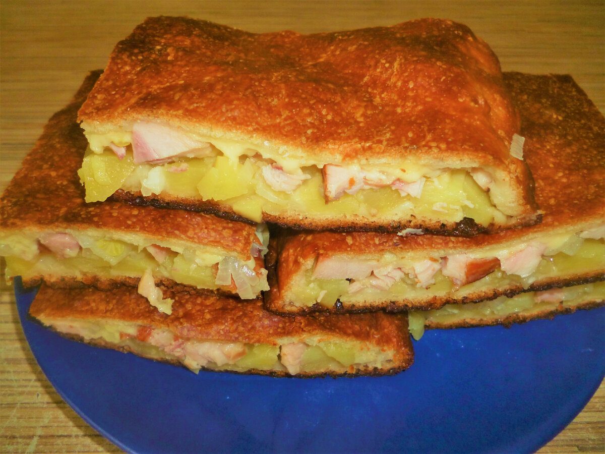 Оригинальный вариант такой крытой пиццы мы пробовали в кафе под названием "Пицца Миа" в те времена, когда наш сын учился в Екатеринбурге. А это - доморощенная версия, которая не только очень напоминает настоящую, но и превосходит ее по вкусу. Во всяком случае, так утверждают мои сын и муж. Рецепт я когда-то нашла в интернете. Не уверена, конечно, что в "Пицца Миа" готовят именно по нему. Но рецепт - прост, не затратен финансово, а результат нас всегда радует. Так что, с удовольствием поделюсь с Вами. Поскольку вариант с копченой курочкой нам нравится больше всего, о нем я и расскажу. Но ее легко можно заменить и бекончиком, и копченой шейкой, да и просто копченой колбаской. Здесь важен аромат и вкус копченостей, а каких - не принципиально. Тесто используется дрожжевое. Его можно приготовить по любому рецепту, который вам нравится, а можно воспользоваться моим. Единственно, что можно посоветовать, не нужно много дрожжей: слишком пышное тесто в данном рецепте не нужно. Нам потребуется: