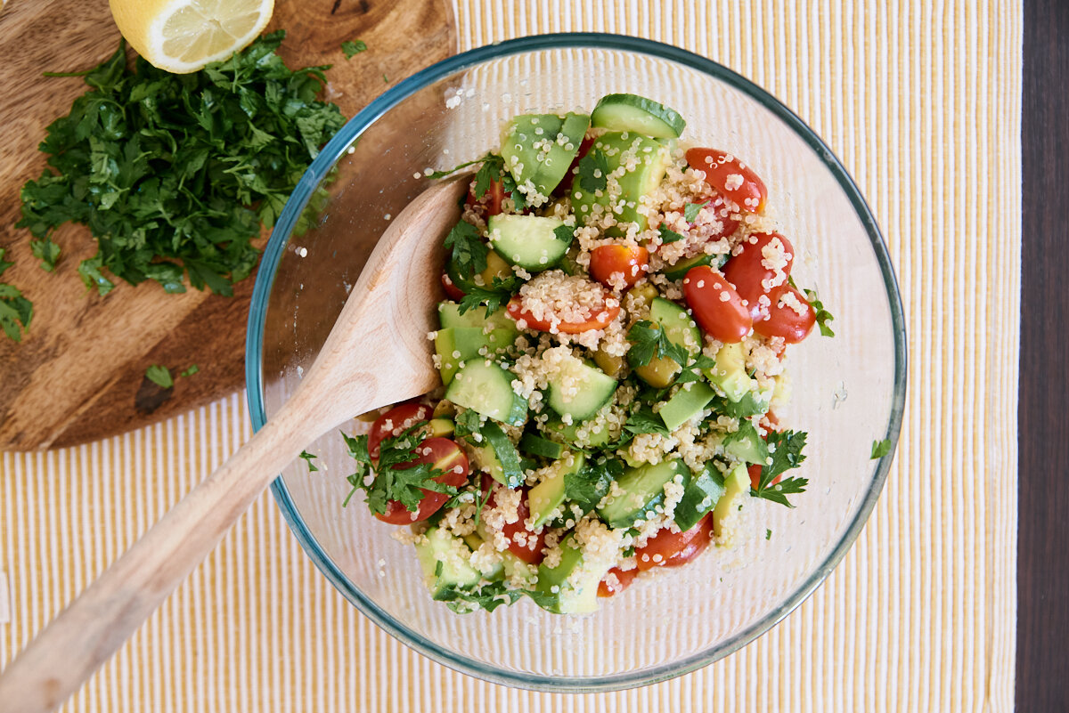 Смешайте готовую и заранее охлажденную киноа с овощами. Заправьте лимонной заправкой и подавайте к столу.