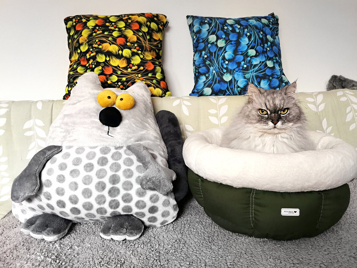 У нас уже лето в разгаре, поэтому чудесные домики и кото-тазики с муфтами от Лены Пикиной (тили-бом, тили-бом) попрятались от жары в укромные места, завернувшись в пакеты. Оставила только кото-подушку для себя, очень удобно на ней возлегать за просмотром интересных фильмов. 😸 Слева на фото, справа неудобная для меня подушка, она когти выпускает и в нос пушистой задней частью лезет. Ещё и звуки издаёт. Котобанда нашла себе новые лежанки, пришлось освобождать полку. Теперь у нас имеется персональный плацкартный вагон: есть нижняя полка, а есть верхняя. Иногда в вагон подсаживается "заяц", занимая чужую полку. И так второй день. Сначала Бонька спал на этом месте, потом пришёл Финя (который наверху сидит) и утроил скандал: спать рядом с Плюшкой он не хочет, а отдельное место в вагоне подавай. Пришлось освобождать второй ярус, и теперь все довольны. Но садятся они на этот "поезд" строго по расписанию, то есть после 10 утра. А до этого Бонька смотрит сериал про птичек на передвижном "подок