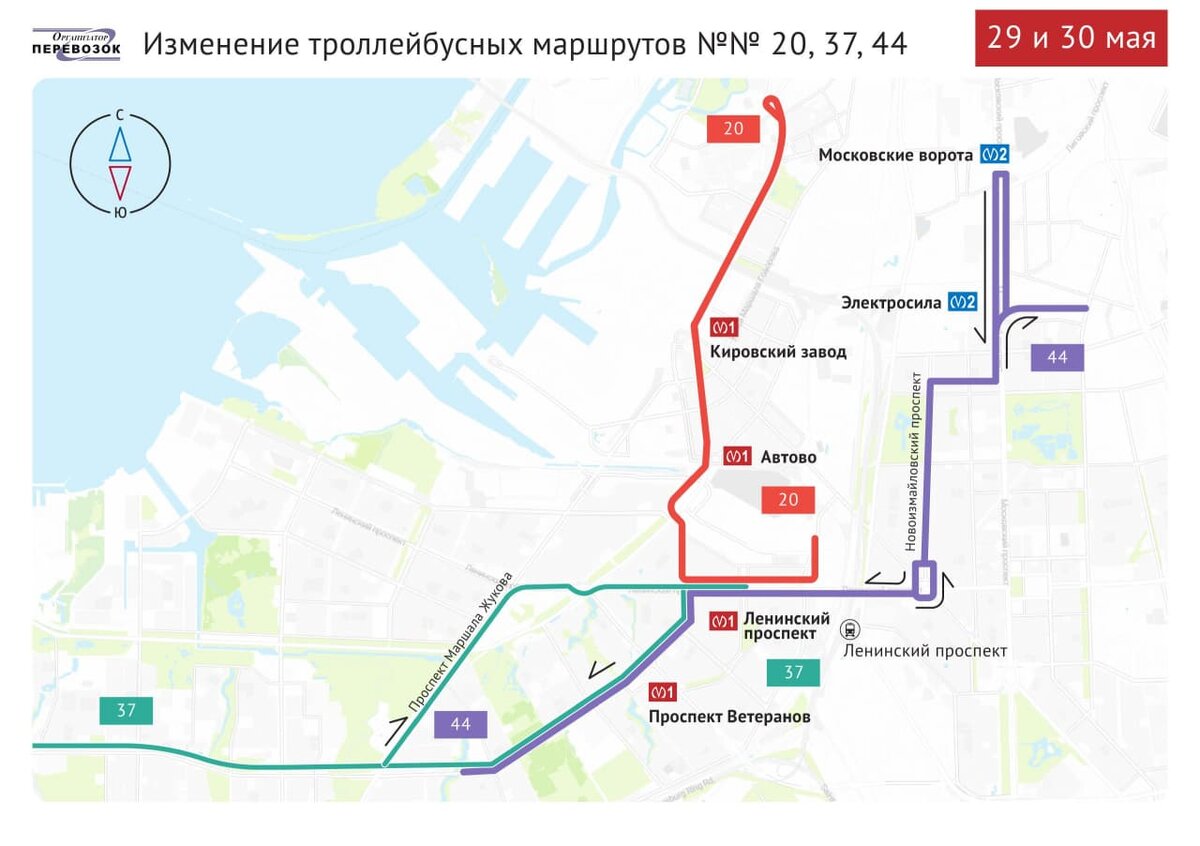 29 и 30 мая, в связи с производством работ по реконструкции водопроводной сети на пр. Ветеранов у Нового моста, закрывается движение в одном направлении от Авангардной ул., и вносятся изменения в трассы троллейбусных маршрутов №№ 20, 37, 44.