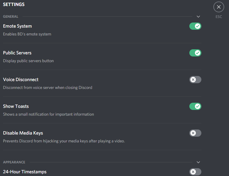Settings - Основные настройки BD и Доп. настройки самого Discord.
