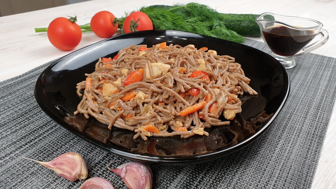 Соба с курицей. Куриное филе с гречневой лапшой и с овощами. Вкусная курица по-японски.