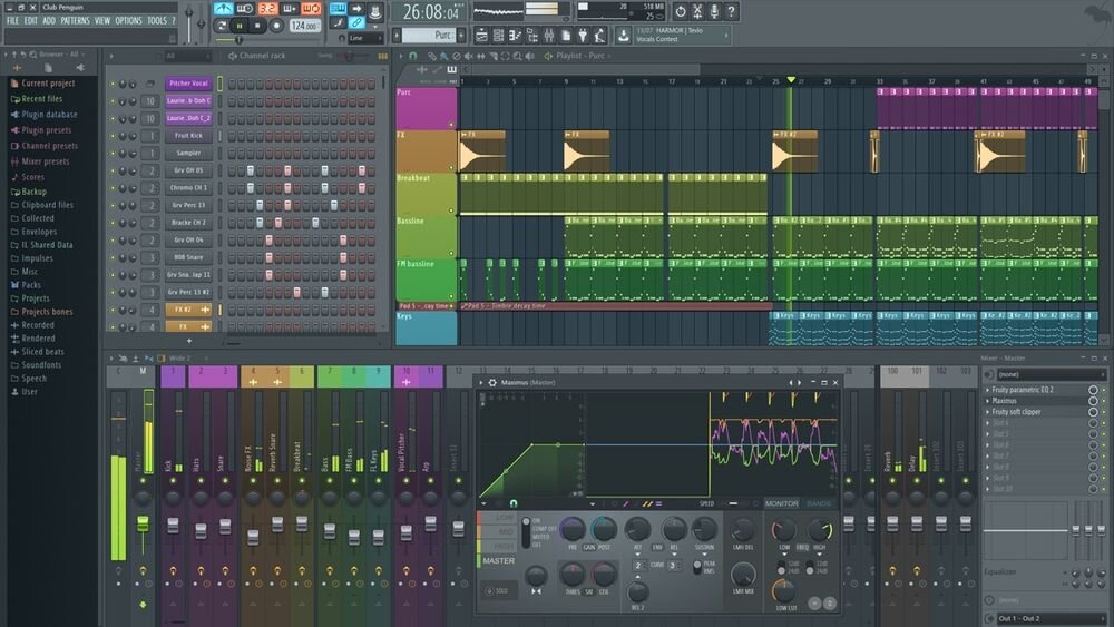 Каждый инструмент отводите на отдельный канал в микшере ,делайте это сразу,после прописания партии каждого инструмента .Каждый инстрмент требует эквализации . Для чего? Для устранения частотных конфликтов ! За счёт эквализации происходит своего рода выделение инструментов , эквализации требует и кик, и хэт, и снейр ,и фортепиано,которое вроде не плохо звучит . Используйте компрессию (отличные компрессоры в пакете Waves) .Не забывайте про пространство ,используйте ревербираторы и т.п.