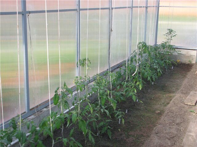 Весь процесс ухода заключается в поливе рассады, подкормке, а при необходимости, в формировании куста и подвязке. Подвязка как правило осуществляется дней через 12 после высадки рассады. Для этого можно использовать шпалеры, натянуть горизонтально шпагат или этот самый шпагат спустить с потолка к каждому кусту. Другое, что необходимо сделать – пасынкование. Обычно удаляются все пасынки, которые доросли до 8 см. Удалять можно руками, аккуратно обламывая веточки или секатором. Для разных типов сортов используют различные способы пасынкования. Полив помидоров в теплице Следующий важный этап – это полив. Первые дней 10 после высадки рассады поливать ее нет надобности – она в этот период приживается. Затем начинается достаточно интенсивный полив. При этом надо помнить, что вода должна быть комнатной температуры. До начала цветения томаты поливаются раз в пять дней из расчета на один квадратный метр 5 л воды. После того, как начнется цветение, расход воды надо увеличить до 10-13 л.