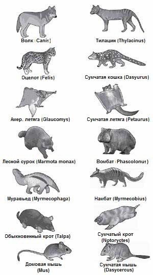 Один из подобных примеров- это поразительная схожесть плацентарных и сумчатых (животных Австралии), представленных на картинке. Предполагается, что эти животные не имеют общего предка в обозримом прошлом и похожий внешний вид они приобрели совершенно независимо.