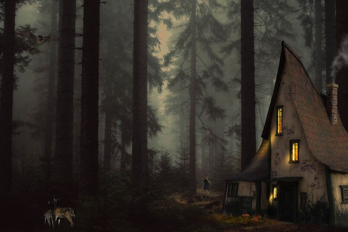 И вот оно - случайное знакомство заблудившегося охотника с двумя загадочными, дикими женщинами, хозяйками дремучей "избушки на курьих ножках". Старая и страшная бабуля и молодая, красивая брюнетка.
