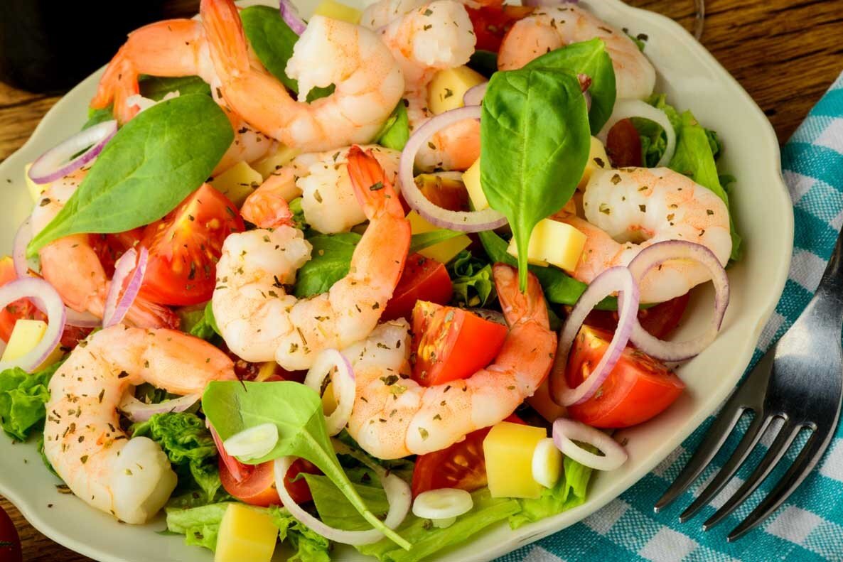 Креветки поступают в продажу замороженными в брикеты в сыром или вареном виде. Перед использованием их надо варить, предварительно промыв в холодной воде. Воду довести до кипения, положить в нее соль, мелко нарезанную морковь, зелень петрушки или укропа, лавровый лист, перец горошком, а после закипания креветки. Посуду накрыть крышкой, быстро довести воду до кипения и продолжать варку при слабом кипении: сырые креветки варить 10 - 12 мин., вареные - 3 - 5 мин. Готовые креветки оставить в отваре в течение 5 - 10 мин. Для салата у креветок используют только шейку, удалив с нее панцирную оболочку. При этом вначале отделить шейку от каркаса креветки, а затем удалить с нее оболочку. Промытые листья зеленого салата нарезать на несколько частей, оставив несколько листиков для украшения, уложить его горкой в середине салатницы, а вокруг разместить "букетами" свежие огурцы, нарезанные кружочками, вареные морковь, яйца, свежие яблоки или помидоры, кусочки вареной цветной капусты, зеленый горошек. Вареные креветки положить сверху горки зеленого салата. При подаче на стол овощи заправить салатной заправкой и посыпать укропом. Отдельно подать майонез. Также можно приготовить салат из крабов. Салат из креветок можно приготовить и иначе. Для этого овощи и креветки смешать, заправить майонезом, положить горкой в салатницу, украсить продуктами, входящими в салат, и посыпать укропом.