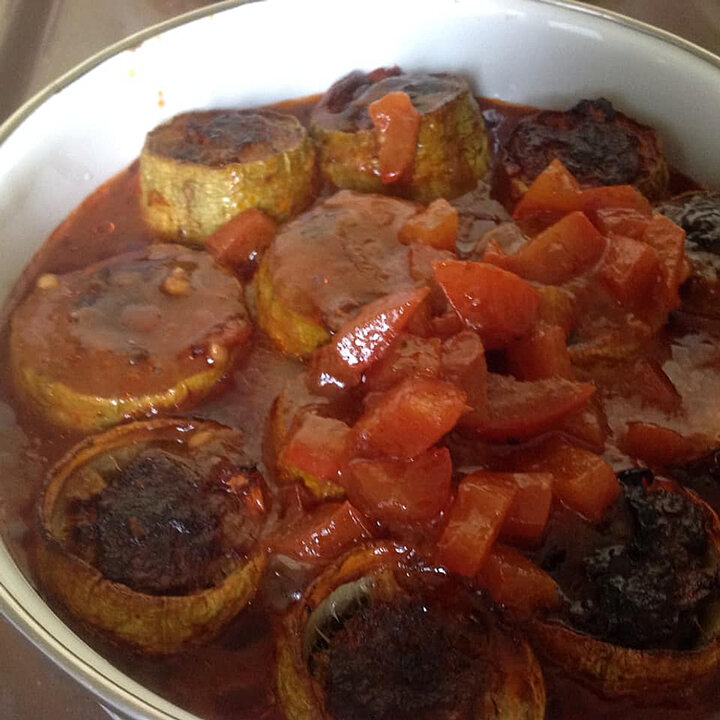 Оказалось, что на базаре кабачки гораздо дешевле, чем в магазине. Воспользовалась этим... В мясной фарш (говядина + индейка) добавила 2 столовых ложки рубленых хлопьев геркулеса, мелко нарезанные помидор, красный болгарский перец (можно и другого цвета), лук репчатый (всё в сыром виде), соль и специи по-вкусу. Из кабачков сделала "стаканчики", разрезав кабачки на две-три части и выбрав ложкой мякоть, так, чтобы у каждой части остались достаточно толстые стенки и донце. Заполнила "стаканчики" фаршем, и тушила в томатном соусе. В конце приготовления подпекла в духовке сверху (можно было бы посыпать сыром, но муж не любит). Результат - на первом фото. Исходная "посуда" - на втором. Больше общения и рецептов - в группе "Жизнь с диабетом" в Facebook и одноимённом Telegram-канале! Рецепт на странице в Facebook Автор рецепта - Надежда Славнова