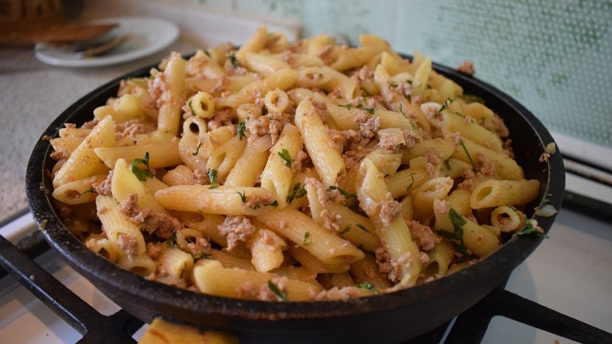 И так немного вступление мне 21 год зовут меня Артем ,живу в деревенской местности ,учусь .Как то вечером заглянув в холодильник и не обнаружив не чего сытного из продуктов я решил приготовить что нибуть на скорую руку . Открыв шкафчик с крупами и всем прочим достал макароны ,но макароны нужно есть с чем то в морозилке был замороженный фарш,а дальше идеи сами полезли в голову .. 1.Ложим фарш под горячую воду буквально на 5 минут ,когда края фарша размякнут можно крошить его в сковороду разогретую на огне добавив чуть масло. 2.Как только фарш начнет чуть набирать золотистый окрас добавим лука можно порезать стручки зеленые ,а можно и разрезать головку на 1/5 часть и добавить к фаршу ,затем добавить томатной пасты или хорошо подойдут помидоры малосоленые из банки,хорошенько перемешав до однородной массы ждем минут 10 и добавляем макароны прямо в сковороду и заливаем водой на 20-25 минут . 3.ждем пока вода выкипит ,перемешав получаем очень вкусное блюдо ,а главное быстро и не испачка