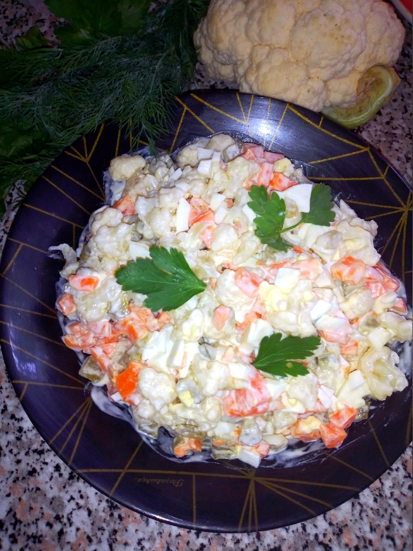 Очень простой и вкусный салат для любителей цветной капусты. Этот салат может смело заменить Оливье и он часто бывает "приглашен" даже на праздничный стол. Попробуйте, я обещаю, что вы не будете разочарованы. Ингредиенты: Морковь и яйца отварить. Капусту разобрать на крупные соцветия. Отварить в подсоленной воде 5-6 минут после закипания. Не переварите! Капуста должна немного хрустеть. Капусту остудить и разобрать на маленькие соцветия или нарезать. Огурцы нарезать мелкими кубиками. Яйца мелко нарезать. Морковь тоже нарезать кубиками и добавить к остальным ингредиентам. Можно добавить зелень. Посолить. Заправить майонезом. Майонез можно заменить на йогурт или сметану. Салат получается нежный и в тоже время пикантный. Приятного аппетита! Буду признательна за лайк и подписку!