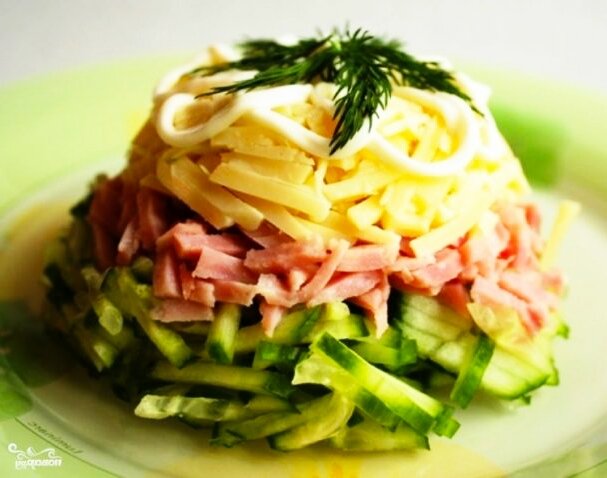 Солнечный салатик :):):):):):):)):):):):):):):):):):):):):):):):):):):):):):):):):):):):):):):):):):):):):):):):):):):):):):):):):):):):):):) Хочу поделиться с вами одним обалденным рецептом отличного,сочного ,красивенного и вкусного салатика. Этот салат мне когда-то посоветовала мама,когда я съехалась со своим мужем, отмечали первый Новый Год вместе и после этого события салатик у нас постоянно на столе, на абсолютно каждом празднике! Пробуйте,девчонки:) Что нам понадобится для этого солнечного чуда: Майонез; Сырок-400 гр; Ветчинка — 400 гр; Огурчик- 2 шт; ЧесночЁк- 4 шт; Приступаем к приготовлению: Салат готовится очень легко и быстро,удобный вариант для занятых хозяюшек. Мы просто режем все продукты соломкой , а сыр натераем на тёрке,смешиваем с подавленным чесноком,покрываем всё майонезом и посыпаем любимой зеленью, подаём на стол. Приятного аппетита,любимые подписчики!:)