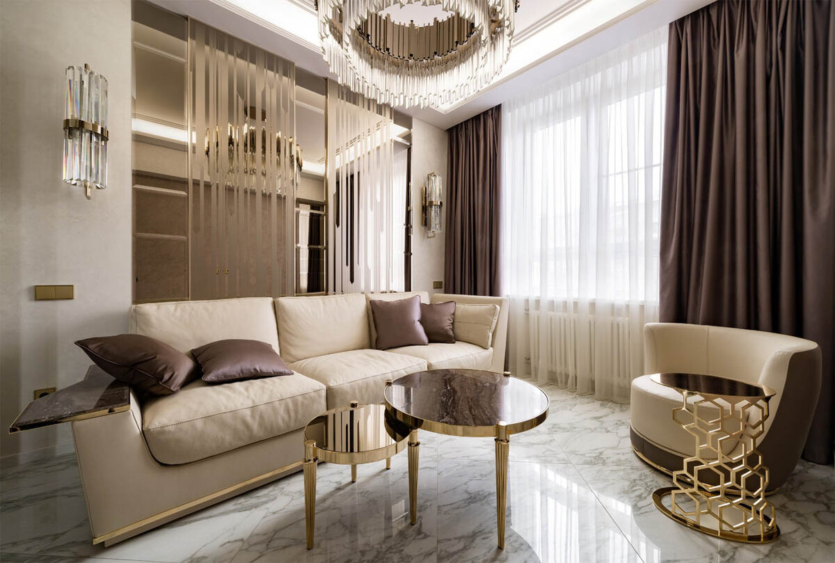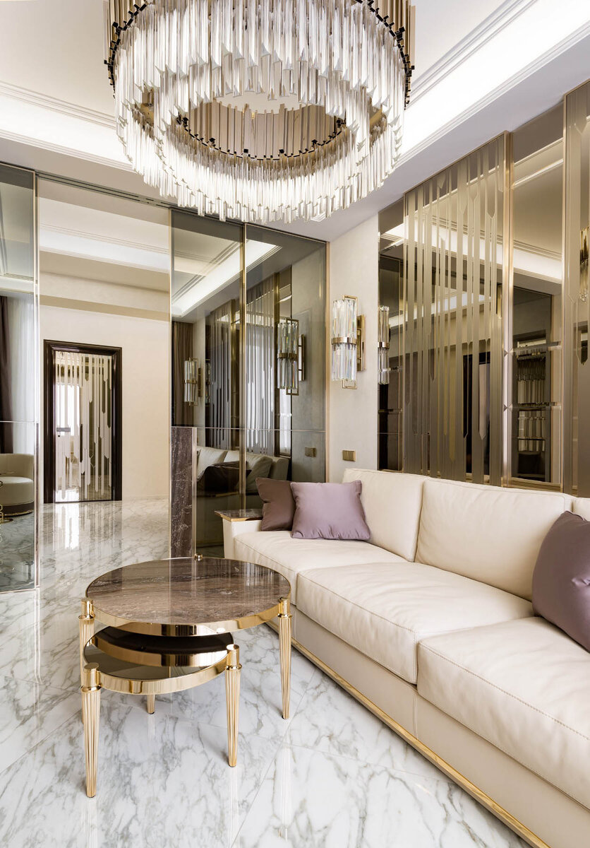 Роскошный и элегантный интерьер создала Мария Закалата, преобразив старую сталинку на Университетском проспекте. Эта квартира изначально обладала массой достоинств: дом с историей окружен зеленью, в уютном дворе царит непривычное для мегаполиса спокойствие, толстые стены дома обеспечивают идеальное шумопоглощение. Перед автором проекта стояла задача использовать все эти плюсы, разработав современный, функциональный и эстетичный интерьер, в основу которого было решено положить стиль ар-деко – выразительный, роскошный, благородный. Над планировкой пришлось поразмыслить: убрать стену из кирпича было невозможно, поэтому пришлось призвать на помощь декоративные возможности, обыграв эту конструкцию. Этот выбор в итоге пошел на пользу интерьеру, задав ему определенную ритмичность и четкость рисунка, обязательные для ар-деко. Вертикальные линии вытягивают небольшую гостиную, добавляя ей стройности и композиционной выразительности. Кухню Мария Закалата выполнила в более современном ключе, основ