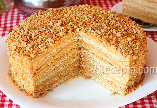 Каждый корж обильно промазываем кремом, не забывая про боковины. Обрезки теста измельчаем и посыпаем ими торт сверху и по бокам. Оставляем торт на 4 часа, чтобы он пропитался.