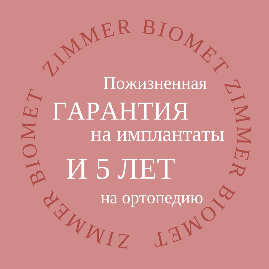 Чем отличается премиальная система имплантации от других? Отвечаем: качеством самого продукта как для пациента, так и для врача, а также качеством сервиса. Самой важной частью сервиса являются гарантийные обязательства, их длительность, быстрота реакции компании в случае наступления гарантийного случая. ГАРАНТИЯ НА ИМПЛАНТАТЫ ZIMMER BIOMET DENTAL Мы напоминаем о том, что премиум имплантаты Zimmer Biomet имеют пожизненную гарантию. Установка имплантата Zimmer Biomet — это долгосрочное, пожизненное вложение в своё здоровье. Гарантийные обязательства — это обещание, за выполнением которого будет следить международный бренд с блестящей 94-летней историей работы. Существует предубеждение, что для исполнения гарантийных обязательств необходимо доказывать, что ситуация произошла не по вине пациента, собирать аргументы, тратить время. Это не так. Обратившись к лечащему врачу в случае проблем с установленным имплантатом Zimmer Biomet Dental, замена и операция производится БЕСПЛАТНО. ГАРАНТИЯ НА