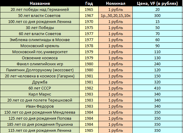 А вот здесь вы можете посмотреть, сколько сегодня стоят юбилейные и памятные монеты времен СССР. Цены для таблицы я взял средние по результатам мониторинга на нескольких ресурсах для коллекционеров. Но даже при этой усредненности запросто можно наблюдаться разброс цен, так как, к примеру, на одном ресурсе продают монету за 80 рублей, а на другом за 160 при наличии одинаковой сохранности. Данные цены в таблице являются лишь приблизительным ориентиром для оценки вашего "богатства". Обратите внимание Я указал цены лишь для одной сохранности - VF. Такую сохранность имеют монеты, которые были в свое время изъяты из обращения, а потом хранились в копилках, баночках и прочих ящичках. Данный ценник предназначен для широкого круга лиц, которые имеют простое человеческое желание узнать о стоимости имеющихся у них монет. Ярые нумизматы, естественно, подобными ценниками не пользуются, так как вполне себе представляют, сколько стоят юбилейные советские монеты (да и собирают такие монеты только в