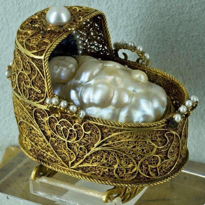Может и недаром говорят, что нельзя до родов готовить приданое для малыша? У этой удивительной драгоценности трогательная и грустная история. Щекастенький жемчужный младенец, укутанный в жемчужное же покрывальце, мирно спит в колыбельке из золотой филиграни. Головка ребёнка покоится на подушечке, украшенной двадцатью восемью бриллиантами и черно-белой эмалевой "вышивкой". Внутри колыбель выстлана голубым шелком и украшена крошечными жемчужными бусинками. На задней стороне (за головой младенца) надпись "Auguror Eveniat" - "в ожидании события". Изюминка украшения - то, что младенец и одеяльце изготовлены из крупного барочного жемчуга. Экземпляры такого размера считаются редкими и очень ценятся ювелирами (сама колыбель 49х55 мм, жемчужина-одеяльце чуть меньше). В 1692 году пфальцграф-курфюрст Иоганн Вильгельм Пфальцский преподнёс этот шедевр голландских ювелиров своей жене Анне Луизе Медичи, которая носила под сердцем его ребёнка. Золотая колыбель должна была стать оберегом для детской
