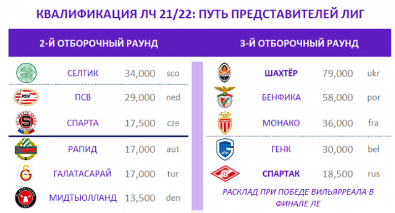 Пока расклад таков: в первом раунде «Спартак» встретится с «Бенфикой», «Монако», «Генком», «Селтиком», «Мидтьюлландом», «Рапидом» или «Галатасараем». После финала ЛЕ из этого списка пропадёт либо «Монако», либо «Генк», а затем 16 июня ещё две команды.