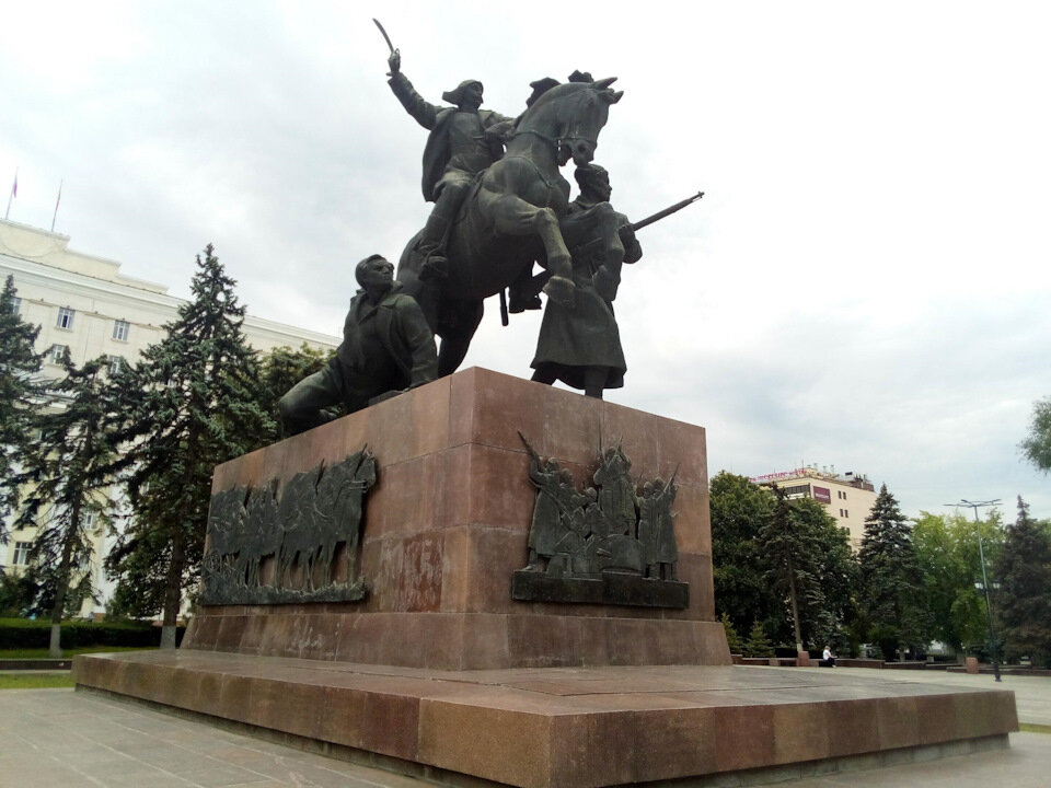 На этой площади застыла на постаменте монументальная скульптурная группа из всадника на вздыбленном коне, солдата с ружьём и матраса с гранатой. Памятник был создан знаменитым автором "Родины-матери" на Мамаевом Кургане Евгением Вучетичем, который провёл в столице "Тихого Дона" своё детство и юность, здесь же он получил первое художественное образование в школе Чиненовых (ныне это Ростовский художественный техникум имени М.Б. Грекова). Вучетич создал для Волгограда монументальную группу