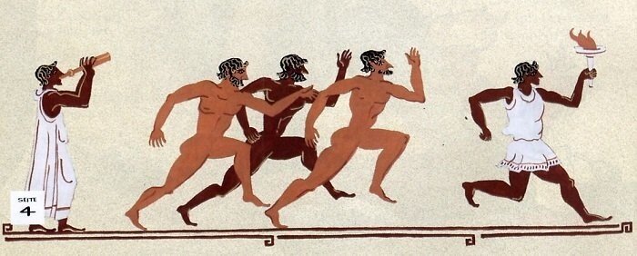 Первые игры в Олимпии прошли в 884 г. до н.э., это были соревнования в беге на один стадий (190 метров). Бегуны выстраивались на стартовой линии во весь рост, протягивая правую руку вперед, и ждали сигнала судьи «элланодика». Если кто-то из атлетов опережал стартовый сигнал, он подвергался наказанию - судья бил провинившегося спортсмена припасенной для этой цели тяжелой палкой. Соревнования в беге родились из религиозного ритуала – с давних времен на празднествах в честь бога Зевса состязались в беге с факелами, и победитель зажигал огонь на алтаре.