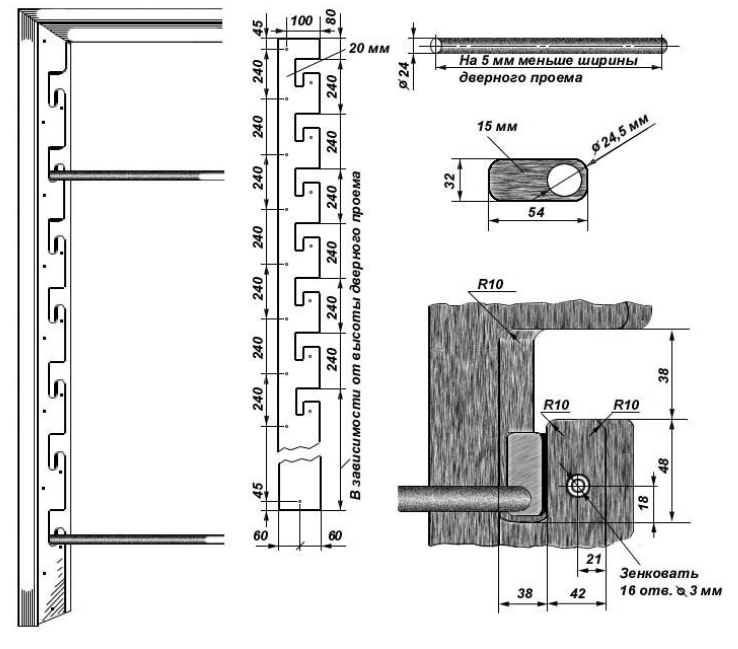 Детали: - 2 деревянные стойки; - 14 запорочный вкладышей из дерева твердой породы; - 7 металлических перекладин (куски труб); - шурупы для крепления стоек к косякам; Сборка: 1. Разметить гнезда и отверстия для шурупов одновременно в двух стойках, положенных друг на друга. 2. Закрепить запорные вкладыши на концах перекладин с помощью клея. 3. Для повышения прочности вкладыши можно обить снаружи тонкой жестью.