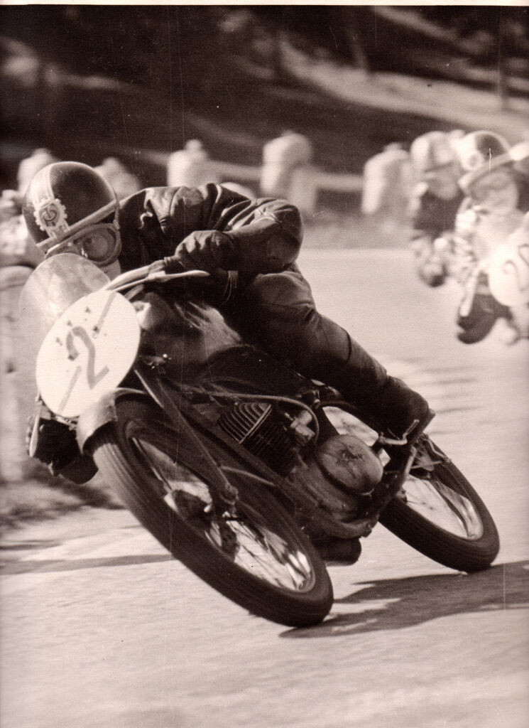 Представитель спортивного общества "Трудовые резервы" на мотоцикле К-125С заходит в поворот.