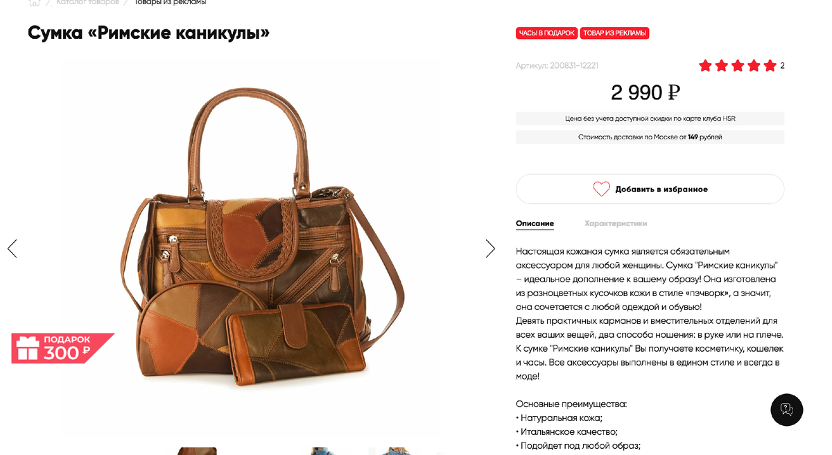 Приветствую любителей онлайн покупок! Наконец-то приехал мой долгожданный заказ и я, конечно, очень хочу поделиться впечатлениями. Купила в Мой Мир в подарок для своей матери сумочку с романтическим названием — Римские каникулы! Присмотрели мы с мамой эту сумку накануне 8 марта, когда подбирали подарки близким, она привлекла внимание и заинтересовалась. Любит она сумочки такого стиля и я про себя решила, что нашла-таки идеальный подарок на день рождения. Сумочка судя по описанию на сайте сделана из натуральной кожи, что подразумевает ее долговечность по сравнению с искусственной, которая достаточно быстро покрывается мелкими трещинами и приобретает крайне неэстетичный вид. Поэтому я отдаю предпочтение кожаным, они долговечнее, и в данном случае совсем не дороже. Стоимость сумочки составила 2990 рублей, и это недорого для кожаного изделия таких размеров. Заказывала я с сайта, после оформления мне перезвонила оператор, уточнила детали заказа и адрес доставки. Оплачивать покупку я как