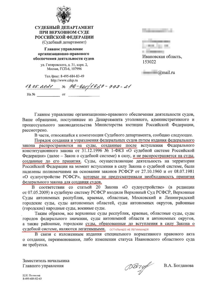 Судебный Департамент при ВС РФ - районные суды не подчиняются закону о судебной системе и существуют вне судебной системы РФ. Т.е. по всем решениям районных судов всех посылаем на ... . Приставов, полиц., и т.д., т.к. СД при ВС РФ ОБЪЯВИЛ их, т.е. объявил, что они вне судебной системы РФ и их решения не обязательны для кого бы то ни было в РФ. Т.е. он объявил что они не подчиняются закону РФ о судебной системе, и не являются судами РФ.