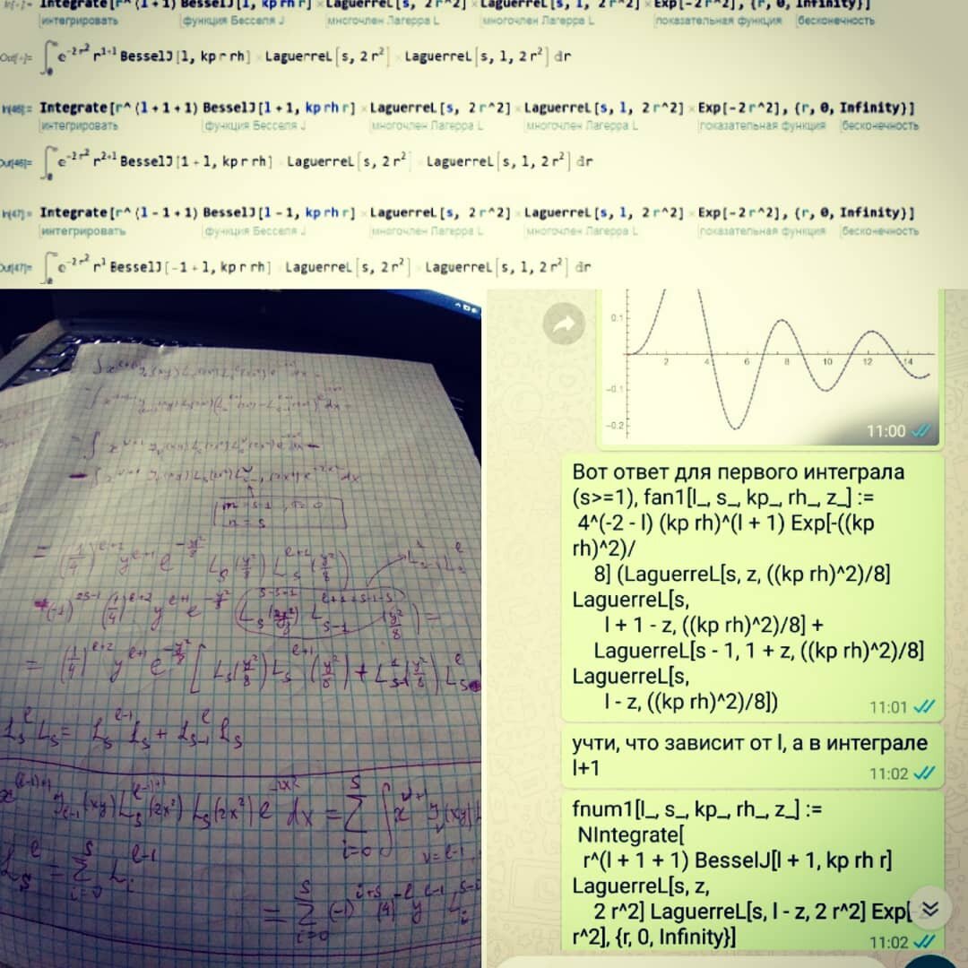 Будни теоретика - вычисление интегралов, чем я сегодня с утра и занимался. Чисто эстетически хочется чтобы интеграл взялся. Но чисто статистически вероятность этого равна нулю (неберущихся интегралов в бесконечное число раз больше чем берущихся). Чисто практически, хорошо когда интеграл можно вычислять численно. Но он же начинает осциллировать, медленно сходиться и строить всякие козни. К счастью, теоретики работают со сферическими конями в вакууме и часто все таки удается взять этот самый интеграл. Главное найти производящий интеграл, правильно в него запихнуть параметр, подифференцировать, если есть полиномы, то посмотреть на их реккурентные соотношения, покрутить туда сюда и... готово.