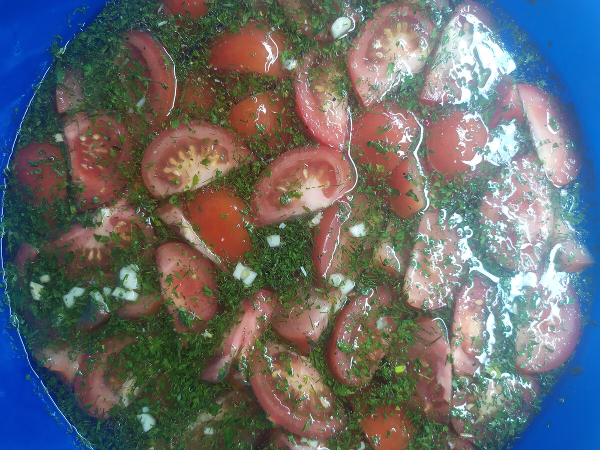 Сушеную зелень, примерно 3 ст.ложки.Хорошо перемешиваем, оставляем в сторонку. Отдахнуть☺️ Для маринада понадобится: 1.5 литра горячей воды, 7 ст.л. уксуса,4 ст.л. растительного масла, 2 ст.л. соли, 1.5 что.л. сахара. Все перемешать, до растворения соли и сахара. Залить 🍅🍅 накрыть тарелкой, поставить под прес. Через 40 минут можно кушать. Но мне нравиться более долгий маринад, достала свои помидорки на следующей день.